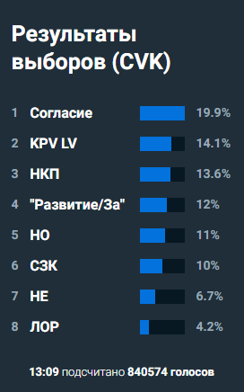 Как сообщил латвийский портал Delfi, партия набрала 19,9% голосов. "Согласие" получит в Сейме 24 мандата — ровно столько же, сколько в парламенте нынешнего созыва.