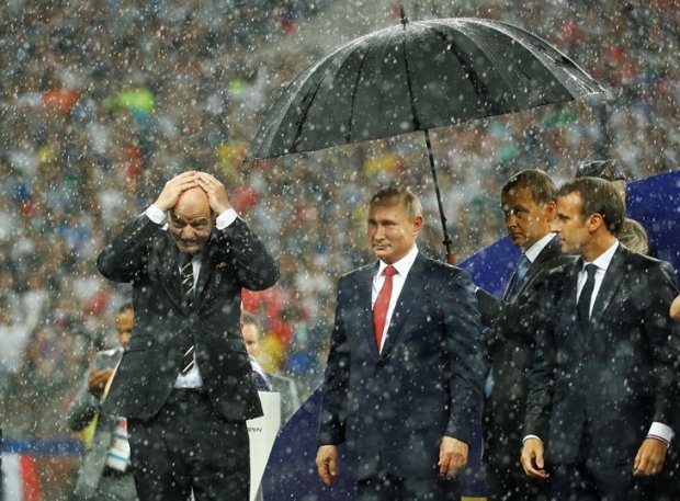Буквально с началом вручения наград участникам матча в Москве начался сильный ливень. Через несколько минут главе Кремля принесли зонтик, под которым тот прятался от стихии. При этом другие почетные гости продолжали мокнуть под дождем.