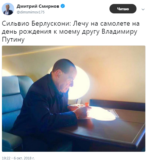 "Бывший премьер-министр Италии трижды судимый за педофилию Сильвио Берлускони сообщил на своей странице в Facebook, что полетел на день рождения Путина", – пишут на Twitter странице "Распад и неуважение".