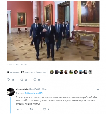 "Это он успел до или после подписания закона о пенсионном грабеже? Или сначала Полтавченко уволил, потом закон подписал мимоходом, потом с Курцем пошёл гулять?", - говорится в другом комменте.
