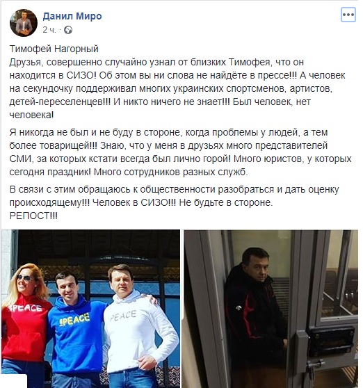 "Друзья, совершенно случайно узнал от близких Тимофея, что он находится в СИЗО! Об этом вы ни слова не найдете в прессе!!! А человек на секундочку поддерживал многих украинских спортсменов, артистов, детей-переселенцев!!! И никто ничего не знает!!!", - написал Миро.
