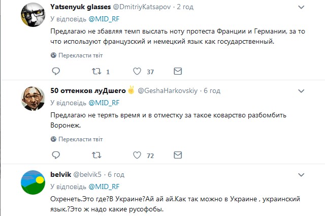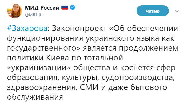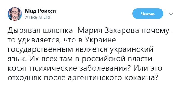 "Дырявая шлюпка Мария Захарова почему-то удивляется, что в Украине государственным является украинский язык. Их всех там в российской власти косят психические заболевания? Или это отходняк после аргентинского кокаина?" - насмехается в Twitter блогер Мид Роисси.