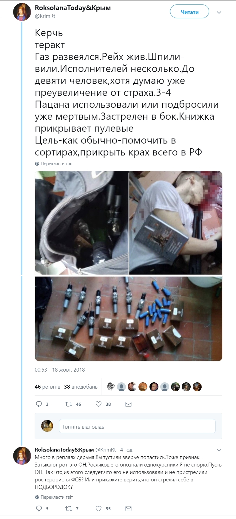 Пользователь RoksolanaToday&Крым также выразил убеждение, что массовое убийство в колледже в Керчи организовали российские спецслужбы, которые после этого всячески пытались отвлечь внимание людей от сути, а Росляков был просто жертвой.
