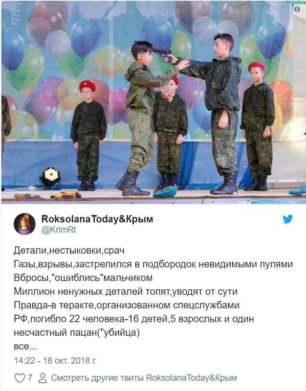 Пользователь RoksolanaToday&Крым также выразил убеждение, что массовое убийство в колледже в Керчи организовали российские спецслужбы, которые после этого всячески пытались отвлечь внимание людей от сути, а Росляков был просто жертвой.