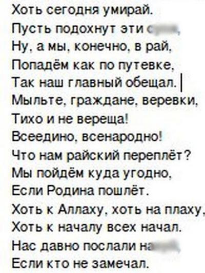 «Мы пойдем куда угодно, если Родина пошлет. Хоть к Аллаху, хоть на плаху, хоть к началу всех начал. Нас давно послали на…, если кто не замечал», — напоминает музыкант.