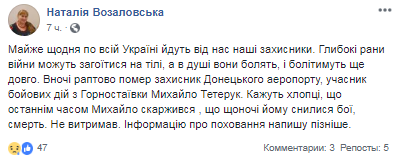 "Ночью внезапно умер защитник Донецкого аэропорта, участник боевых действий из Горностаевки Михаил Тетерук. Говорят ребята, что в последнее время Михаил жаловался, что каждую ночь ему снились бои, смерть. Не выдержал", - написала она, добавив, что позже напишет информацию о захоронении.