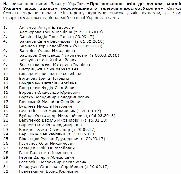 Министерство культуры Украины обновило 22 октября список российских артистов, которые создают угрозу национальной безопасности.