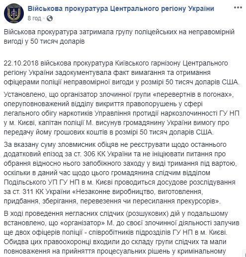 В Киеве прокуратура задержала 22 октября офицеров полиции на взятке 50 тысяч долларов США.