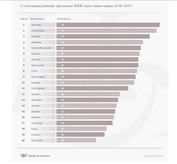 Лучшей страной для получения ВНЖ в 2018 году признана Австрия. Она показала самый высокий показатель качества жизни и репутации страны. Австрия потеснила с первой строчки лидера последних годов Португалию. В 2018 году страна заняла второе место, а третья позиция досталась обновленной программе Италии.