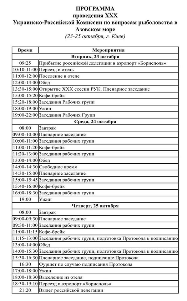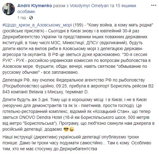 "В РФ это называется очень красноречиво: "30-я сессия РУК" - РУК - российско-украинская комиссия по вопросам рыболовства в Азовском море. Фуршеты, обеды, ужины, даже праздничное "обмывание по русскому обычаю" - все запланировано", - написал он.