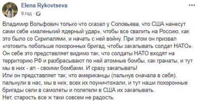 Рыковцева недоумевает: "Он себе это представляет видимо так, что солдаты НАТО входят на территорию РФ и разбрасывают по ней атомные бомбы, как гранаты, и тут мы в них - ап - своими бомбами. И сразу закапывать! Или он представляет так, что американцы (пальнув сначала в себя), пальнули в нас, мы в них, всех их по уничтожали, и тут наши похоронные бригады сели в самолеты и полетели в США их закапывать".