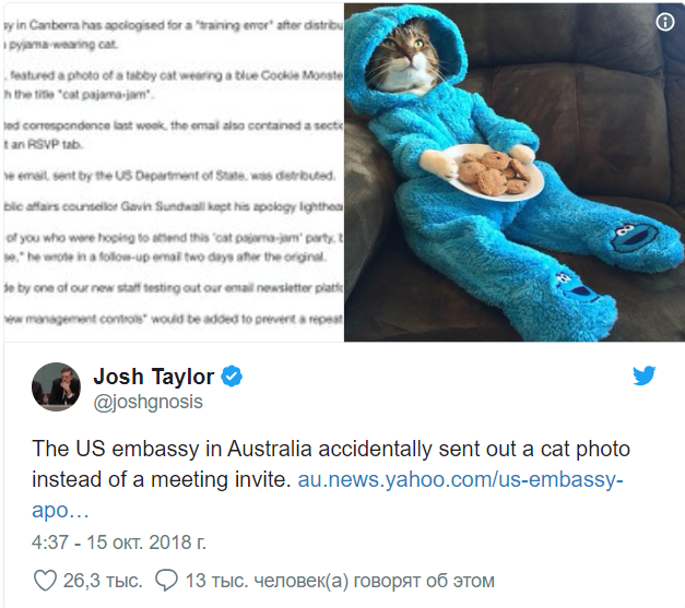Американское посольство в Австралии случайно разослало приглашения с котиками в пижамах (фото)