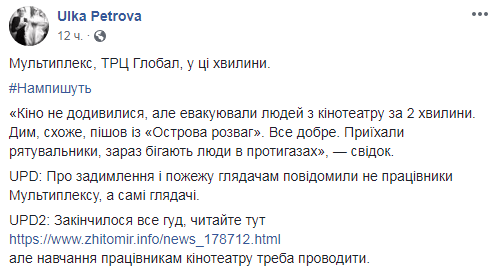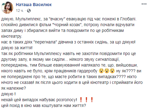 "Спасибо, "Мультиплекс", за "своевременную" эвакуацию при пожаре в "Глобал". Спокойно смотрели фильм "Черный казак", понемногу начали чувствовать запах дыма и собирались выйти и сообщить про это рабочим кинотеатра. Нас в таких действиях "перегнала" девушка из последних сидений, за что спасибо! Спасибо за жизнь! Так как рабочие "Мультиплекса" даже не захотели сообщить об этом второму залу, в котором мы сидели... никакого звука сигнализации, предупреждений, тем более эвакуации! Напугало то, что, выйдя, никого даже не было, кроме работников гардероба. Ну как?", - написала Наташа Василюк в соцсети.