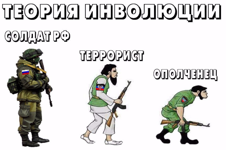 На изображении воинов армии Путина разделили на три вида: солдаты РФ, террористы и ополченцы. Представителя первой категории автор нарисовала обычным бойцом при полном обмундировании, а далее, по ее теории, началась "эволюция".