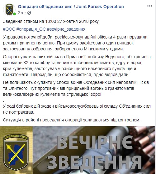 В субботу, 27 октября, боевики на оккупированном Донбассе нарушили режим прекращения огня 4 раза, при этом один раз они применили вооружение, запрещенное Минскими соглашениями.