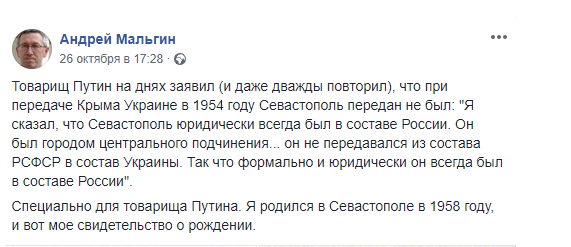Мальгин, который родился в Севастополе в 1958 году, обнародовал доказательство того, что при передаче Крыма Украине город также был передан УССР.