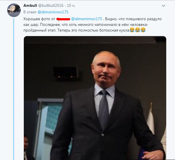 «Хорошее фото от Смирнова. Видно, что плешивого раздуло как шар. Последнее, что хоть немного напоминало в нём человека- пройденный этап. Теперь это полностью ботоксная кукла», «Сверху ботокс, снизу глина, посредине кевлар (загадка о российском колоссе)», «На общей фотографии видно,что Путин и Эрдоган пожимают руки сверху,а если верить психологам,это указывает на властный характер человека. Меркель же с Макроном позволили себя держать за руки. У Макрона вообще такое выражение «Что я здесь делаю?» или Что это сейчас было?», — говорится в комментариях под публикацией пропагандиста.