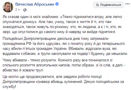 "Почему убивали - тяжело понять. Каждый раз все начиналось с совместного распития алкогольных напитков, затем оскорбления, по их словам, а дальше - убийство и прятали труп", - написал Аброськин.