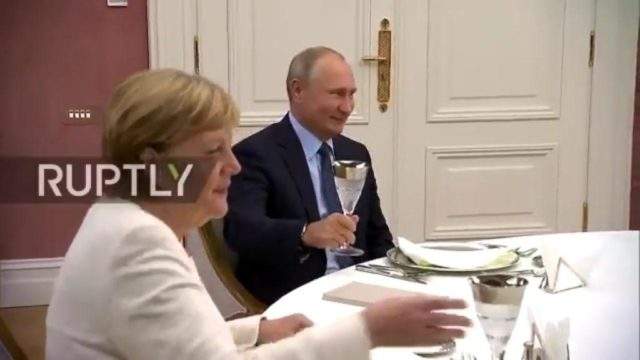 «Путин вроде дальше на пару метров, Меркель - ближе. Но именно у Меркель вроде рюмочка великоватая, а вот у Путина - чуть ли не ведро в руке», - написал он.