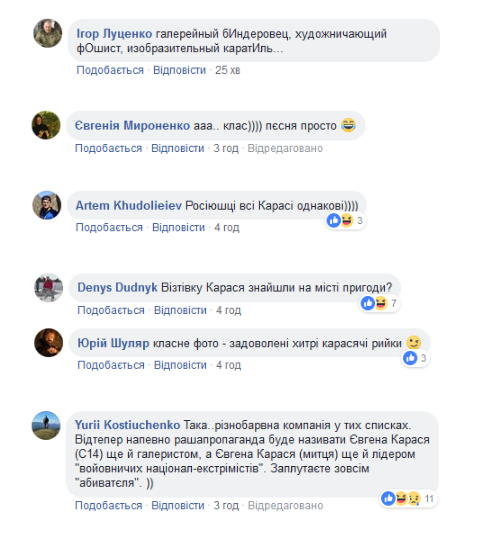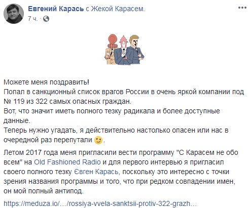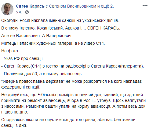 "Сегодня Россия наложила именные санкции на украинских деятелей. В списке Ильенко, Кохановский, Аваков и.... Евгений Карась. Но не Васильевич. А Валерьевич", - написал о себе лидер С14.
