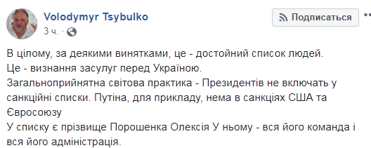 А политолог Владимир Цибулько уверен, что в санкционном списке представлены "достойные люди" и их попадание туда является "признанием заслуг перед Украиной".