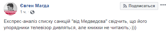 В свою очередь, известный публицист Евгений Магда отметил, что анализ санкционного списка убеждает его в том, что его составители "телевизор смотрят, но книг не читают".