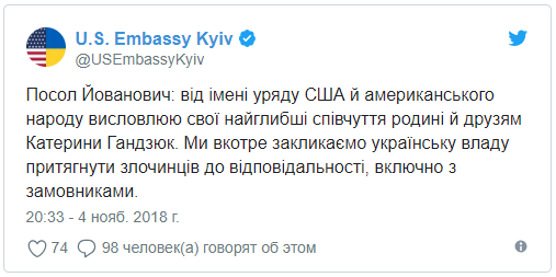 США требуют привлечь к ответственности заказчиков убийства активистки Екатерины Гандзюк, которая умерла в больнице 4 ноября, заявила посол США в Украине Мари Йованович в Twitter.