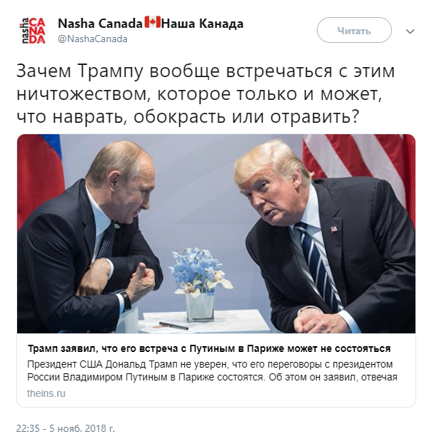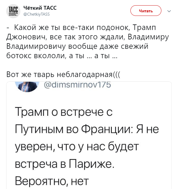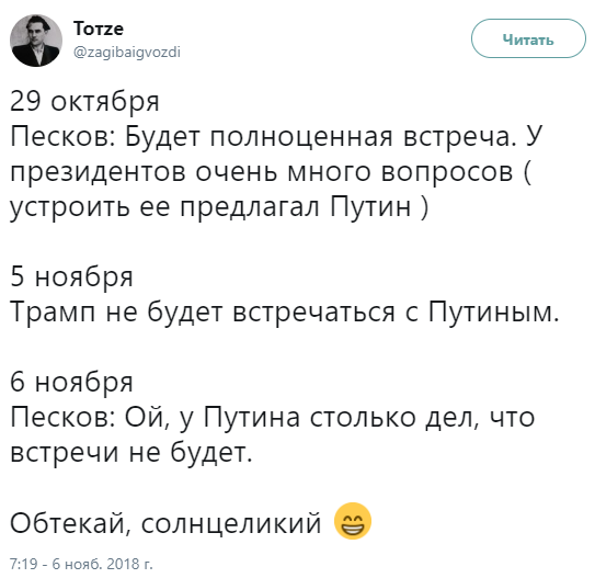 "29 октября Песков: Будет полноценная встреча. У президентов очень много вопросов (устроить ее предлагал Путин). 5 ноября: Трамп не будет встречаться с Путиным. 6 ноября Песков: Ой, у Путина столько дел, что встречи не будет. Обтекай, солнцеликий", "Какой же ты все-таки подонок, Трамп Джонович, все так этого ждали, Владимиру Владимировичу вообще даже свежий ботокс вкололи, а ты... а ты...", - не без сарказма пишут пользователи.
