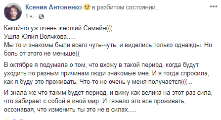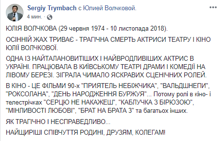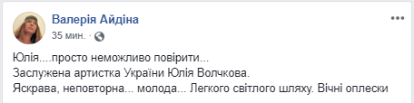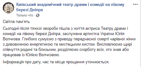 "Светлая память. Сегодня после тяжелой болезни ушла из жизни актриса Театра драмы и комедии на левом берегу Днепра, заслуженная артистка Украины Юлия Волчкова. Глубоко скорбим по поводу преждевременной смерти очаровательной женщины с удивительной энергетикой и художественным талантом. Выражаем искренние соболезнования семье и близким, разделяем скорбь всех, кто знал или работал с Юлией Волчковой", - говорится на странице театра.