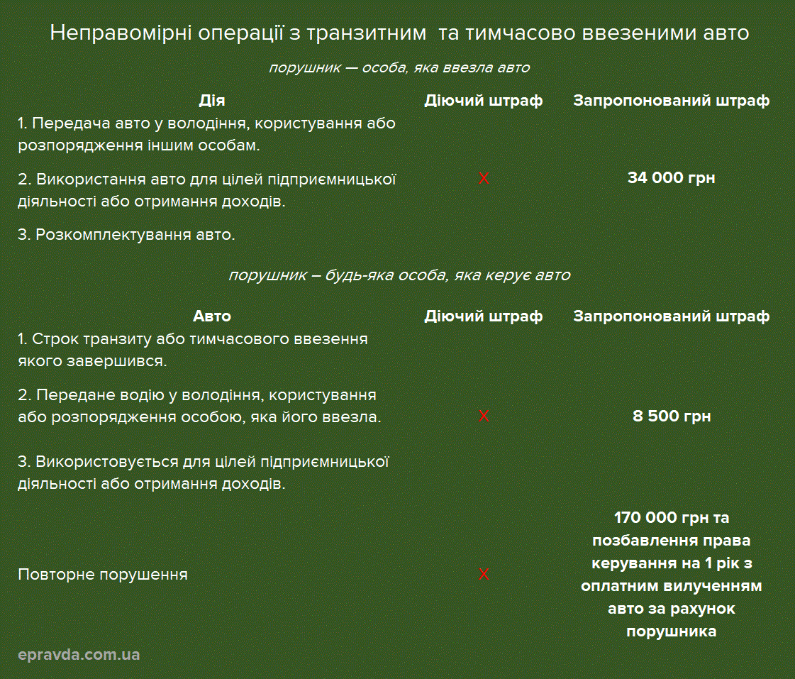 Также законопроект предусматривает введение штрафов за каждый день незаконного нахождения авто на территории Украины. Один день просрочки обойдется нарушителю в 170 гривен, а три дня – уже в 850 гривен.