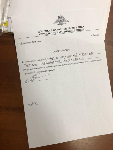 Позже блогер Денис Казанский на своей странице в Twitter обнародовал доказательства того, как террористы "ДНР" обеспечивают явку на так называемые выборы. По его словам, все боевики подписывают обязательства, что будут голосовать за Пушилина.
