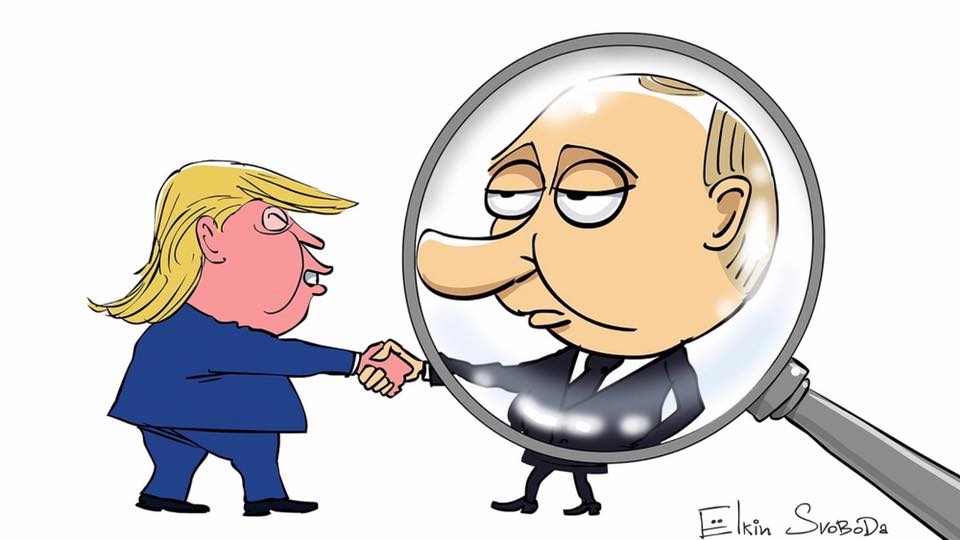 На карикатурах Елкин сделал президента России Владимира Путина "главным героем". Кроме него он изобразил президента США Дональда Трампа и его супругу Меланию, канцлера Германии Ангелу Меркель, а также президента Франции Эмманюэля Макрона.