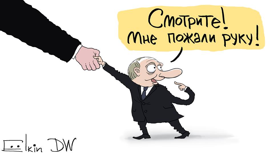 На картинках автор нарисовал самые запоминающиеся ситуации, которые обсуждают в сети: когда Путин опоздал на мероприятие и его рукопожатие с Трампом.