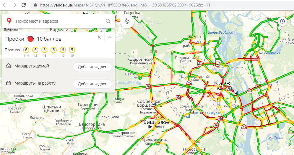 Больше всего движение затруднено в центре Киева, по Набережному шоссе, Воздухофлотскому проспекту, улицах Вадима Гетьмана, Елены Телиги, по проспекту Победы, Кольцевой дороге, на Софиевской Борщаговке. Парализованы и мосты столицы в сторону центра, в частности по Южному мосту, мосту Патона и метро, зaтруднeнo движeниe пo Дaрницкoму шocce.