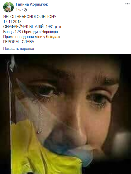 В субботу, 17 ноября, в ходе боевых действий на Донбассе погиб боец Вооруженных сил Украины Виталий Онуфрейчук.