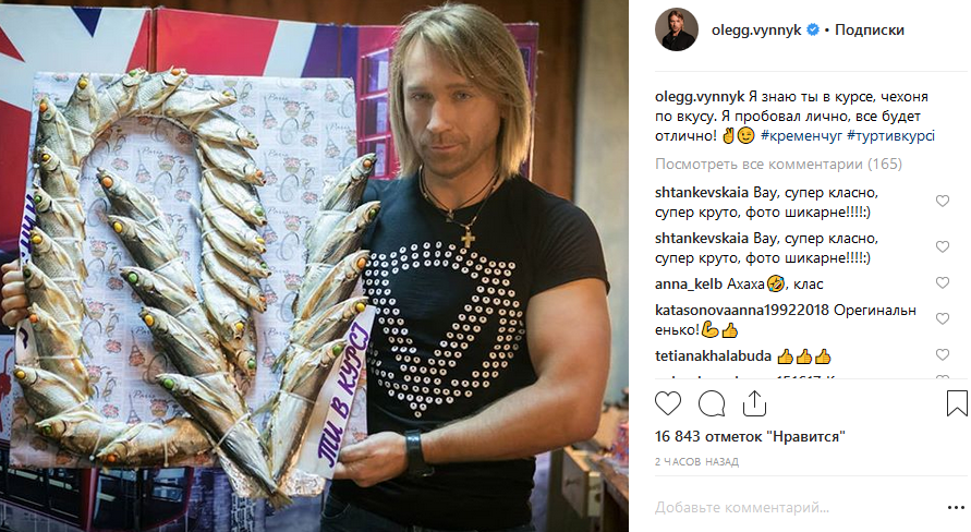 Певцу так понравился презент, что он даже заговорил стихами. "Я знаю ты в курсе, чехоня по вкусу. Я пробовал лично, все будет отлично", - подписал фото Олег.
