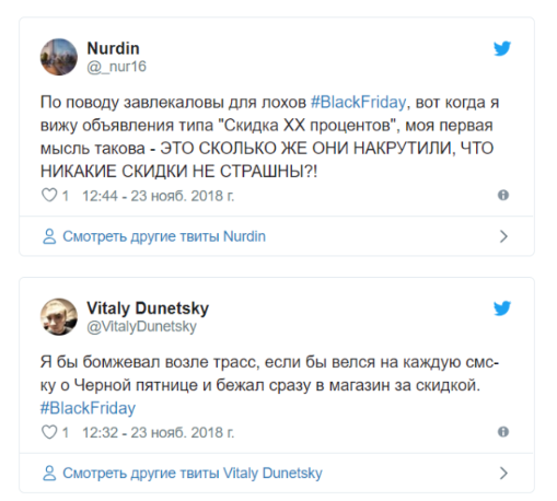 Особенно досталось от шутников наивным покупателям: «По поводу приманки для лохов BlackFriday, вот когда я вижу объявления типа «Скидка ХХ процентов», моя первая мысль такая — ЭТО СКОЛЬКО ЖЕ ОНИ накрутили, ЧТО НИКАКИЕ СКИДКИ не страшні?!», — иронизирует пользователь Nurdin. Эту же мысль поддерживает Vitaly Dunetsky: «Я бы бомжевал у трасс, если бы велся на каждую смс-ку о Черной пятнице и бежал сразу в магазин со скидкой».