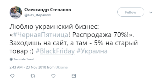 «Люблю украинский бизнес «ЧернаяПятница! Распродажа 70%!». Заходишь на сайт, а там — 5% на старый товар», — пишет по этому поводу пользователь Александр Степанов.