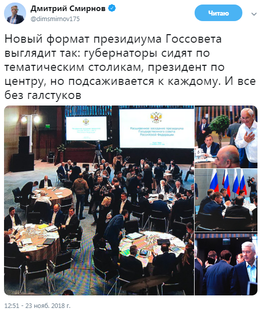 "Новый формат президиума Госсовета выглядит так: губернаторы сидят по тематическим столикам, президент по центру, но подсаживается к каждому. И все без галстуков", – пишет он.
