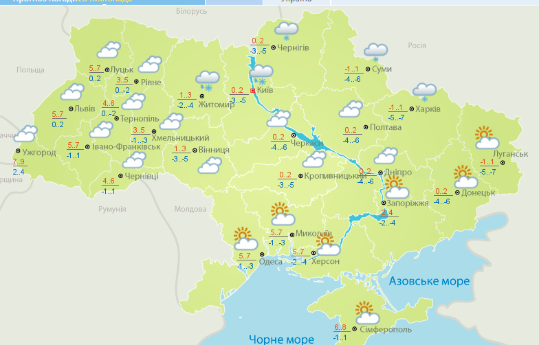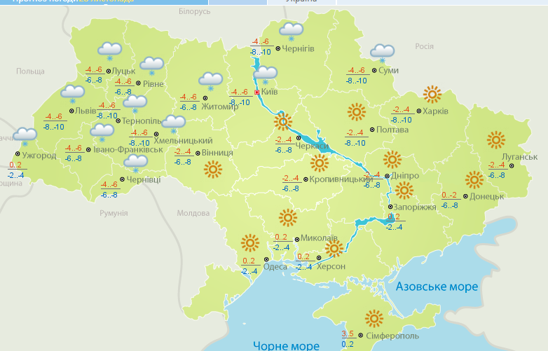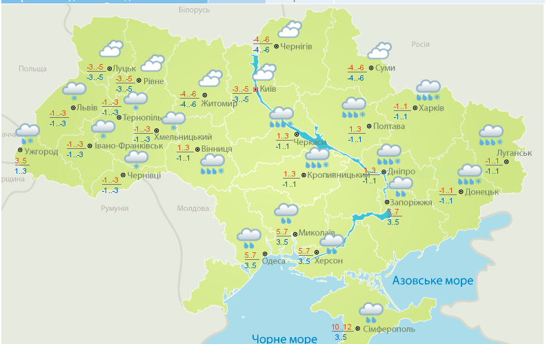 В центральных областях Украины также пройдет мокрый снег. Температура воздуха ночью до -1 градуса, днем преимущественно до +1. На юге пройдут дожди. Ночью +3.. +5 градусов, днем +7..+9. И в восточных областях осадки выпадут в виде мокрого снега. Ночью до -2 градусов, днем +2.. +4. В Киеве днем ожидается снег. Температура воздуха -1…+1 градус.