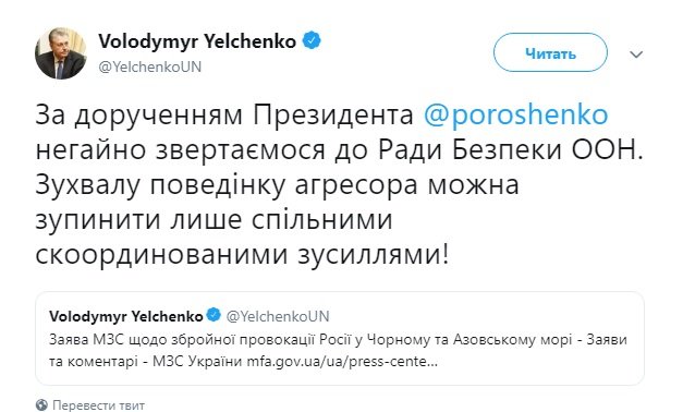"По поручению президента немедленно обращаемся в Совет Безопасности ООН. Вызывающее поведение агрессора можно остановить только совместными скоординированными усилиями!", – написал Ельченко.