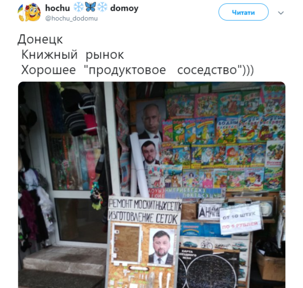 Сообщение выложил в социальную сеть Twitter пользователь с ником “hochu_dodomu”. На фото видно, что портреты президента РФ Владимира Путина и лидера террористического обьединения “Донецкая народная республика” Дениса Пушилина продают вместе с детскими книгами. Кроме того, на торговом месте установлен стенд с надписью «Ремонт и изготовление москитных сеток», очевидно, на окна. На стенде, который имитирует окно с такой сеткой также есть фото нынешнего главаря «ДНР».