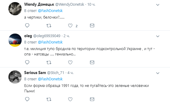 "Та то пацаны цифру в стирку сдали и подменку одели", "А интересно, как лнр-овская милиция их обнаружила-то? В телескоп?", "а чертики, белочки?", "т.е. милиция тупо бродила по территории подконтрольной Украине, и тут - опа - натовцы…. гениально...", "Если форма образца 1991 года, то не пугайтесь-это зеленые человечки Пыни!", "Ничего нового: это те польские негры, о которых уже давно говорит руководство "республики"", "фотки предоставила чичерина?", – пишут комментаторы.