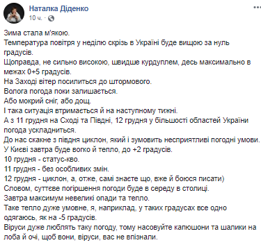"10 декабря - статус-кво. 11 декабря - без особых изменений. 12 декабря - циклон, а, следовательно, сами знаете что, уже и боюсь писать). Словом, существенное ухудшение погоды будет в среду в столице. Завтра максимум осадков и тепло. Такое тепло очень условное, я, например, в таких градусах все равно одеваюсь, как на -5 градусов. Вирусы очень любят такую погоду, поэтому надвигайте капюшоны и шарфы на лоб и глаза, чтобы они, вирусы, вас не узнали", - написала Диденко.