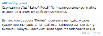 "Сегодня на съезде "Единой России" Путин вдруг оказался почти на ладонь ниже от мелкого Медведева", - отметил Голобуцкий.