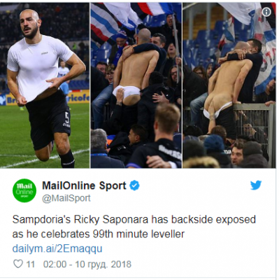 Болельщики футбольного клуба "Сампдория" в порыве ликования раздели догола хавбека Сапонара после того, как он на 99-й минуте матча сравнял счет, и тем самым спас свою команду от поражения в матче с "Лацио".