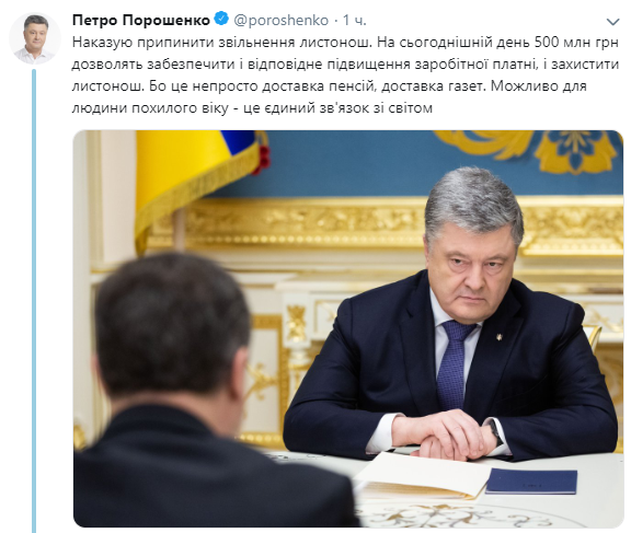 "Приказываю прекратить увольнения почтальонов. На сегодняшний день 500 млн грн позволят обеспечить и соответствующее повышение заработной платы, и защитить почтальонов. Потому что это не просто доставка пенсий, доставка газет. Возможно для пожилого человека - это единственная связь с миром", - указано в посте.