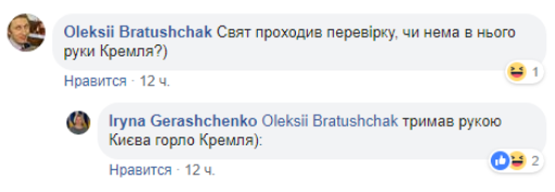«Свят проходил проверку, нет ли у него руки Кремля?» — спрашивал один из читателей, на что Ирина с юмором ответила: «Держал рукой Киева горло Кремля».