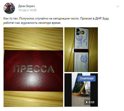 Об этом сам Берич написал 14 декабря на своей странице Вконтакте. "Как-то так. Получилось случайно на сегодняшнее число. Приехал в "ДНР". Буду работать здесь некоторое время", — сообщил Берич.