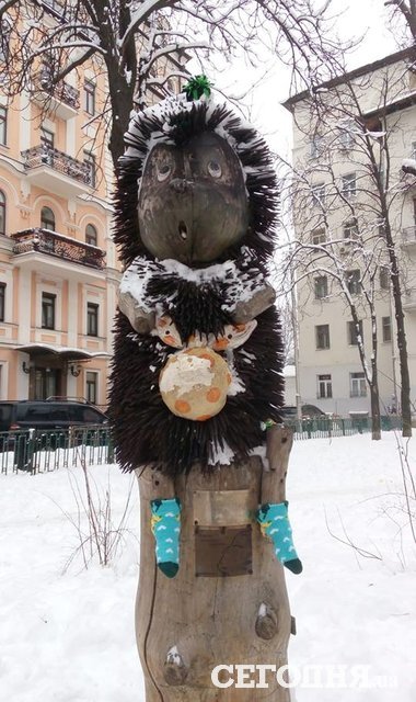 У скульптуры ежика в тумане, которая находится в сквере на улице Рейтарской в Киеве, к празднику появились обновки. Пока ежик спал, Святой Николай успел ему одеть теплые носочки с сердечками, а также игрушку подарил.